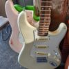 So anyway, I picked up this cheap red stratocaster copy (pictured) for peanuts as part of my recent charity shop haul. It wasn’t damaged at all, other than a snapped tremolo arm, just a bit naff. So I’ve started to Frankencaster it. I’m thinking a relic’d light pink paint job, “SSH” pickup configuration (using old Telecaster lipstick pickups for the single coils), and yes, why not, another Bigsby trem.