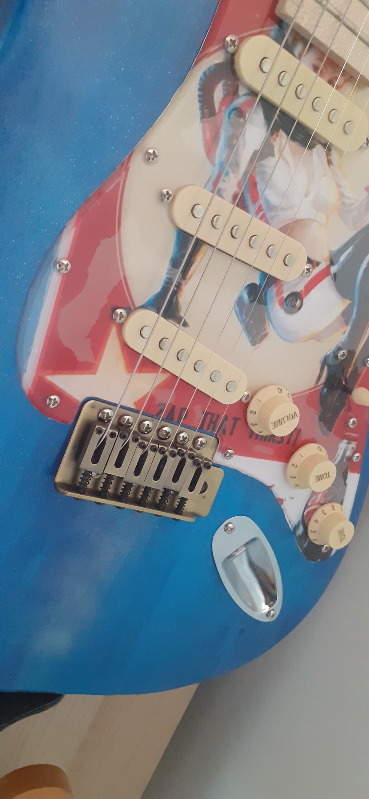 Nine guitars for the ‘Elle’s Guitars’ charitable initiative in nine days, day three. Thanks to a fault in the tremolo block, I nearly had to unveil them out of order and do #4 today. Fortunately, my repair job took me less time than expected. So here we have Nairobi Nine #3 – the Fallout Nuka Quantum strat. Another bag of bits, this one even needed a new neck, so I’m not sure how much of it could honestly be called the original donor guitar any more.