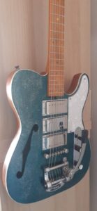 First up this week is DG001 “Fried Green Tomatoes At The Humbucker Café”, my very first Derelict-branded build. Because of the ol’ lifetime ‘back to base’ guarantee, it came in for a change of pickups. The ‘vintage voiced’ humbuckers weren’t really working for anyone, so got switched out for much louder ‘modern voiced’ ones. Took the opportunity to switch up the pickguard from plain white to pearl, and a few other dressings too. It’s now VERY LOUD, about 20% louder using the same settings on my little practice amp than literally anything else I have in my collection at the moment.