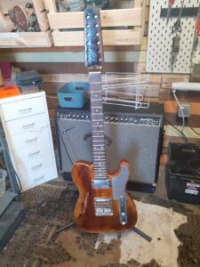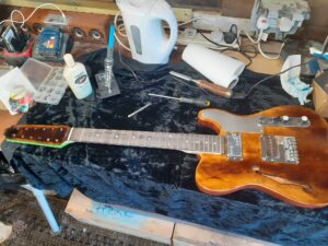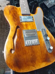 Started to put together ‘The Twelve Labours of Honeybees’, a Telecaster Thinline semi-hollow in walnut, with a beech top stained in ‘honey oak’ with a high gloss finish. That’s a 3+3 humbucker in the neck, and a Seymour Duncan Phat Cat P90 in the bridge. Threw in that engraved Tele control plate cover, along with my usual partial-Cabronita-style chopped-down pickguard (in brushed aluminium). The back is a lovely warm, rich walnut and it’s a maple neck.