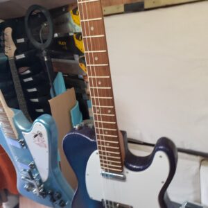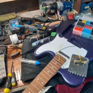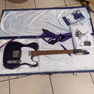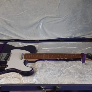 This Telecaster was hewn by my own fair hand from a big lump of mahogany, but uses a ‘donor’ neck (from an Ibanez I bought off a French teenager named Eloïse for €15 on Facebook Marketplace). Originally she was going to be called ‘The Fuchsia Ain’t What It Used To Be”, but my paint sprayer got contaminated and I blasted a load of purple sparkle paint on top of a bright pink undercoat. I liked the new look so much I decided to keep it.