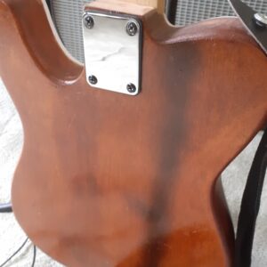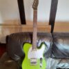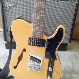 “Moutarde” is the younger brother of ‘Fried Green’ (DG001), and ‘Fuchsia’ (DG006). The same basic configuration of walnut back, white binding and painted beech top on a Telecaster Thinline as ”Fried Green’, but ‘Moutarde’ is, obviously, mustard-coloured and then sports the same pickup configuration as ‘Fuchsia’ – with two Tonerider pickups, an AC4 humbucker in the neck, and a standard bridge. The partial pickguard and (locking) tuners are black, but otherwise the hardware is all chrome. The walnut back is gorgeous, and it plays especially well.
