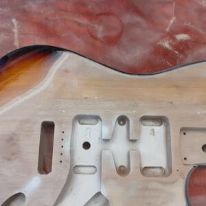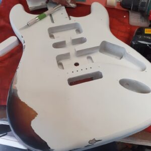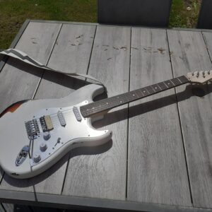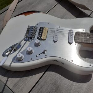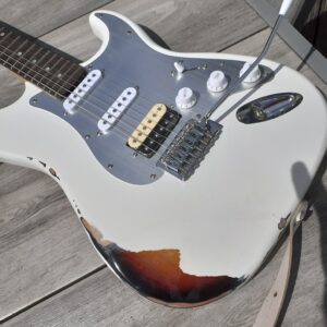It is relic’d – that is, a brand new guitar that has been deliberately aged (to look like a relic). In this case, that involved spraying a partial three-colour tobacco sunburst onto part of the guitar, before adding top coats of a matt white paint that would be stripped, chipped, and sanded away in places to reveal the sunburst colours beneath. So much extra work to make something new look old! The scratchplate is a lovely piece of brushed aluminium, and it’s got a genuine Fender USA 5-way switch and pots, and a Wilkinson tremolo and locking tuners.
