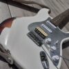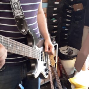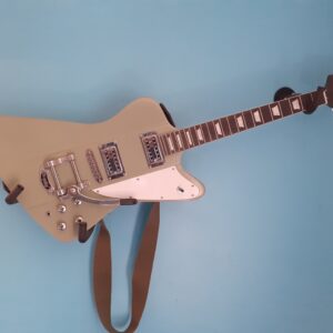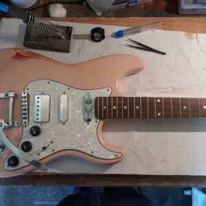 It’s going on the market instead. Sapele body, maple neck with ebony fretboard, Wilkinson pickups, including a Zebra humbucker, and a Wilkinson tremolo system – and I finally gave the brushed aluminium pickguard a home.