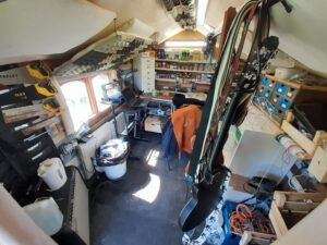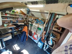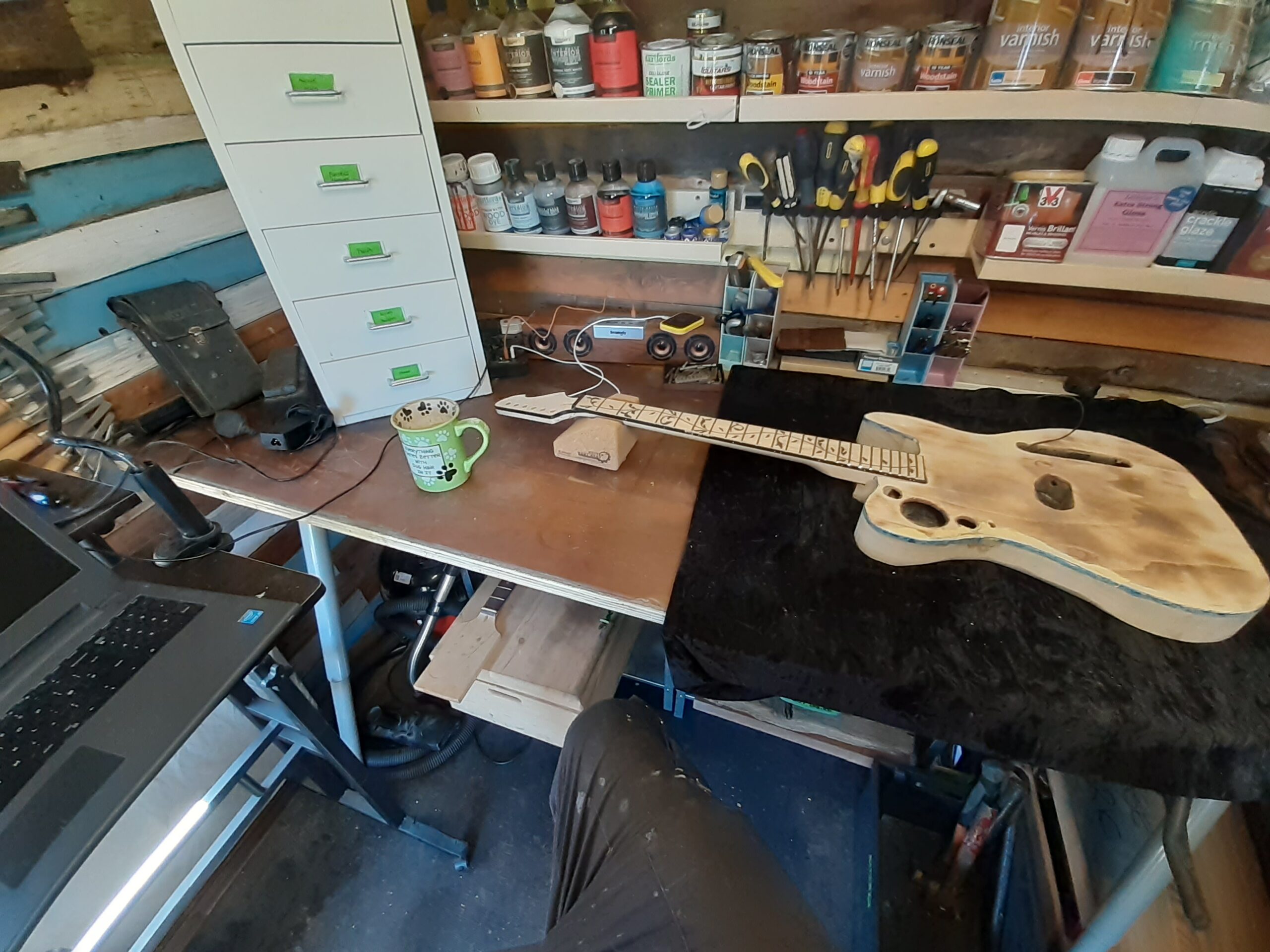 Now that I’m back in the UK for at least 3 months, my baby workshop needed a good re-org, especially with yet another influx of my old tools and bits & pieces from France. All feeling a lot tidier, and on the bench again now is DG014 (“Fantastic Beats…”), the semi-acoustic barncaster, replete with it’s brand new Pearwood top.