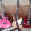 DG014, aka “Fantastic Beats and Where To Barn-Find Them” is a semi-acoustic barncaster Esquire made largely from a piece of European oak that was once a French fireplace mantel, with a pearwood top that features Ovation-style ‘spider eye’ sound holes. Due to the weight of the oak, the guitar is so heavily chambered (hollowed out) that it is practically an acoustic, and indeed has an internal piezo microphone (like an electro-acoustic) in the neck position. The eccentricities of very aged oak (it doesn’t like to be sanded) mean that it has something of a rough-hewn appearance in places, but then it is a Derelict barncaster! Finished in a black sparkle powdercoat, the neck has vine motif inlays, and locking tuners, and the engraved Telecaster hardware features turquoise knobs to match the turquoise pearl purfling and cutdown pickguard. It’ll be a bit of a wrench to sell this, because it has, honestly, an amazingly lovely tone and a very unique look, and is now (because it is so hollow) so light that it would be an easy play for a youngster. £150 to a good home only.