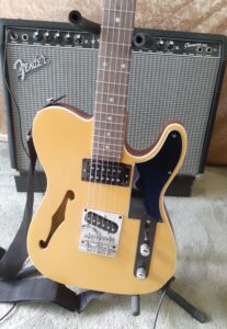 DG008 “Méchant Monsieur Moutarde” is one of a series of hand-built Telecaster Thinline copies with a beefy humbucker in the neck position (this one has a Tonerider AC4, plus a Tonerider bridge single-coil). The body is a stunning walnut, the top is beech – painted in a matt mustard yellow, and it has black and chrome hardware, including locking tuners, and my usual cutdown pickguard. It’s very much a player’s guitar – the action is, I’m told, very comfortable. Just £199.