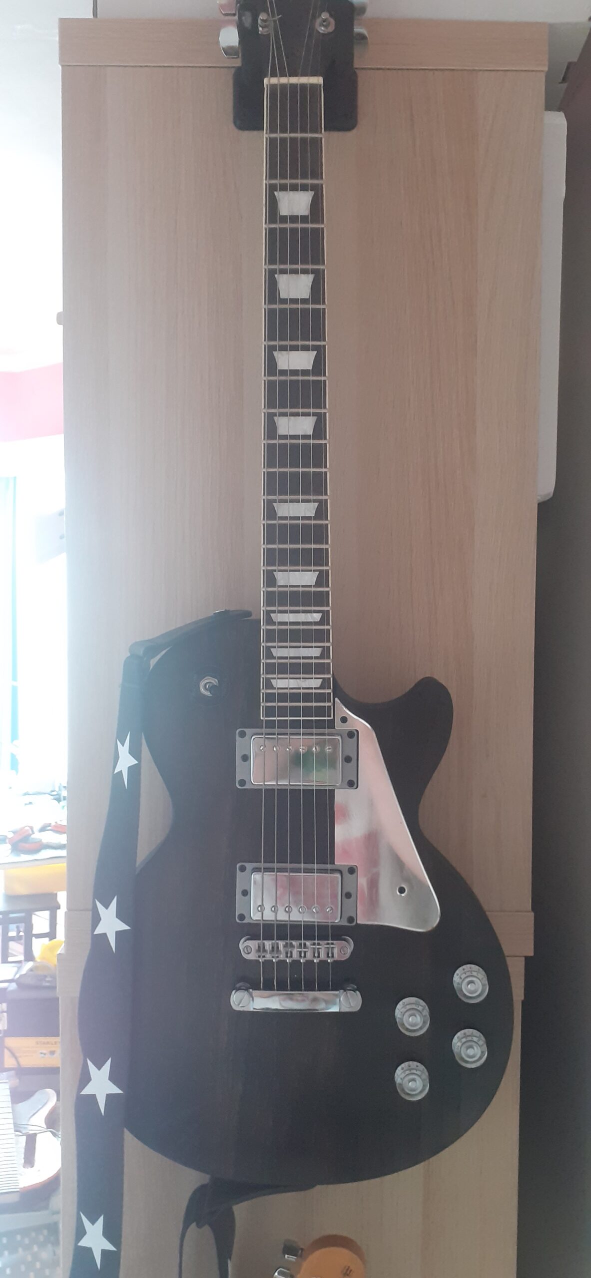 Deez nuts – the nuts for the oddly-sized pots on this Les Paul finally arrived. Whilst every ‘Elle’s Guitar’ is designed to have a free spirit and be quirky and individual, I thought I’d best include another ‘grown up’. This Les Paul is the most complicated three-into-one mismatched jigsaw I’ve done yet. A kit body was combined with the neck and pickups from one donor and the wiring loom and tuners from another. It’s stained ebony with a matt black back and mirrored pickguard, with a discreet nod to its new home – that’s a Kenyan Air Force roundel as the rear switch cover.
