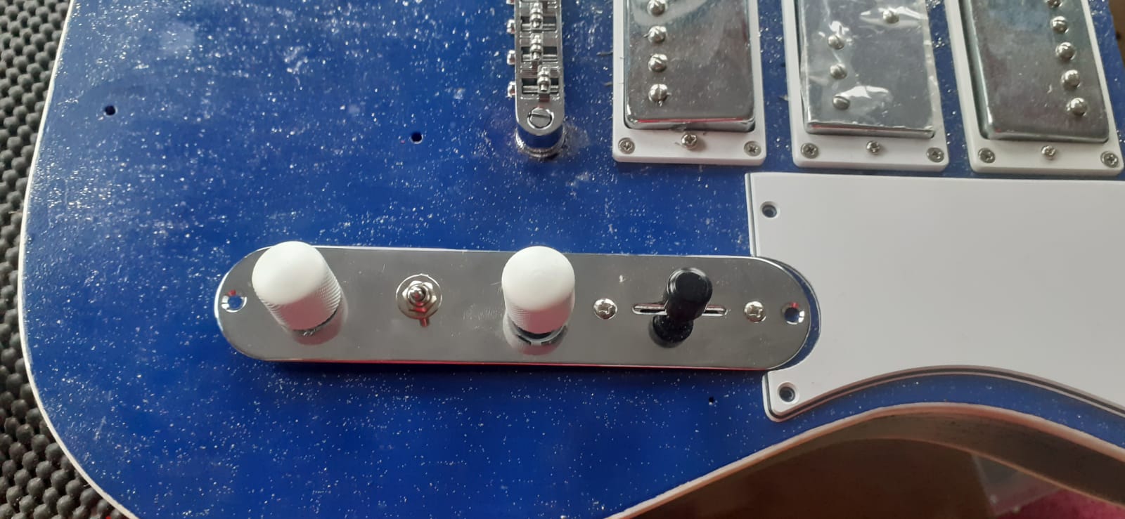 So the current ‘Treblemaker’ on the bench, this blue-sparkle-with-a-Bigsby, is debuting the new system. There’s a standard Tele three-way switch (neck pickup only/both neck and bridge pickup/bridge pickup only), plus a mini-toggle switch between the tone and volume pots that switches the middle pup on or off. This way you can have all three pickups ‘on’, which was impossible using the type of five-way switch I was using.